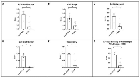 Bar charts of the H&E histological scoring components for the ACL. (A) ECM architecture, (B) cell shape, (C) cell alignment, (D) cell distribution, (E) vascularity, and (F) average severity of microscopic ACL damage. * Indicates significant difference between groups (p < 0.05).
