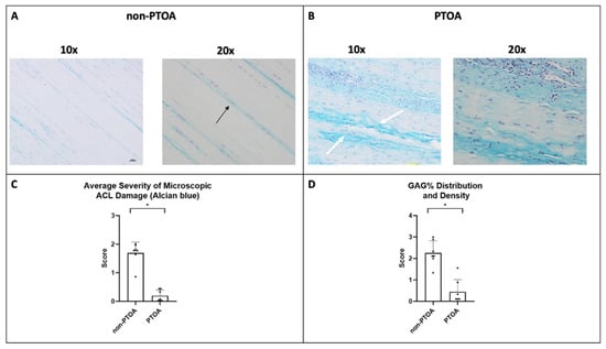 Microscopic changes in ACL. (A) Histological staining (Alcian Blue) images of non-PTOA animals at 10× and 20× magnification, observable uniaxial fiber alignment; black arrows indicate spindle-shaped cells. (B) Images of PTOA animals at 10× and 20× magnification, white arrows indicate areas of high GAG accumulation. (C,D) Scores for extent of microscopic damage. * Indicates significant differences between groups (p < 0.05).
