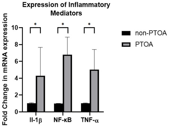The mRNA expression of inflammatory mediators between non-PTOA and PTOA groups measured by the fold changes in IL-1β, NF-κB, and TNF-α. Error bars represent standard deviation. * Indicates significant difference between groups (p < 0.05).