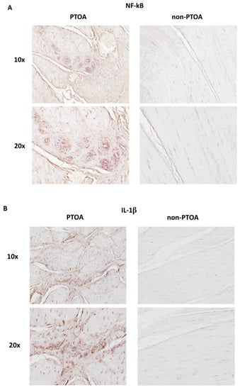 Immunohistochemistry staining of ACL tissue cells. (A) NF-κB staining for PTOA and non-PTOA groups. (B) IL-1β staining for PTOA and non-PTOA groups.