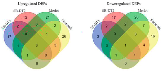 In Merlot, 57 pathways were associated with enriched DEPs, and the significant (p < 0.05) pathways identified include plant–pathogen interaction, autophagy, biotin, and caffeine metabolisms. Similarly, in Stampede, 36 pathways were associated with enriched DEPs, and among these significant (p < 0.05) pathways identified include plant–pathogen interaction, ribosome, proteasome, and galactose metabolism. Merlot and Stampede demonstrated specific enriched pathways related to DEPs, with some commonalities such as plant–pathogen interaction and the proteasome. However, some differences in the pathways they exhibit were based on the enrichment factor and the number of enriched DEPs (Figure 5).