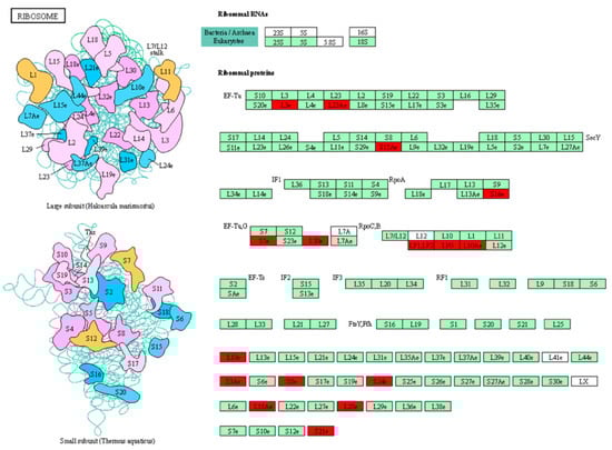 Ribosome pathway with the most upregulated DEPs identified in the sensitive genotype, Stampede under terminal drought stress.