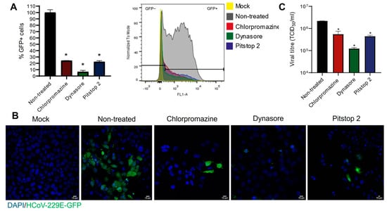 After validating the desired inhibitory effect and concentration of drugs for the rest of this study, the following step was to analyze the effect of such drugs in the entry and infection of HCoV-229E. Briefly, cells were treated with either chlorpromazine, dynasore or pitstop 2 for 1 h, and then they were infected with the virus. The cells were maintained in the presence of the drugs during and after the infection, and samples were collected at 20 h p.i. for flow cytometry and immunofluorescence. When treated with the drugs, a significant decrease in the infection was reported as compared to non-treated cells, as seen in the flow cytometry analysis (Figure 2A), immunofluorescence images (Figure 2B), showing GFP corresponding to viral infection, and titration of viral infectious particles (Figure 2C). The inhibition of the infection in the CME-treated cells, in particular, those treated with dynasore, was achieved in a dose-dependent manner, with 100 µM being the concentration that showed the greatest reduction in infection (Figure S1B). The inhibition of CME by using pharmacological drugs reduces HCoV-229E infection, and thus, the virus might be using this route to enter Huh-7 cells.