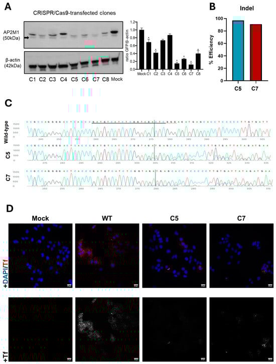 Validation of the knockout of the AP2M1 gene in Huh-7 cells by CRISPR/Cas9. (A) AP2M1 expression was checked by immunoblotting. Western blot analysis of total cell lysates subjected to SDS-PAGE, showing AP2M1 for each subcloned cell. β-actin was chosen as the protein loading control. The black arrow points to the specific AP2M1 band. Values of immunoblot quantification are reported as mean ± S.D. (n = 3); * p < 0.05. (B) Indel values of C5 and C7. Percentage of efficiency of CRISPR-Cas9 cut. (C) Sanger sequence view showing wild-type (control) and edited (C5, C7) sequences in the region around the guide sequence. The horizontal black underlined region represents the guide sequence. The horizontal red underline is the PAM site. The vertical black dotted line represents the actual cut site. Cutting and error-prone repair usually result in mixed sequencing bases after the cut. (D) Conjugate transferrin internalization is blocked in AP2M1-KO cells. The uptake of transferrin in KO AP2M1 Huh-7 cells C5 and C7 is blocked. Cells were maintained for 30 min on ice with Tf CF®543 (5 μg/mL). Finally, they were incubated 5 min at 37 °C before fixation. Nuclei were stained with DAPI. Scale bar = 20 µm. Original images can be found in Supplementary Materials.