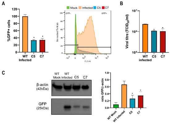 The knockout of AP2M1 in Huh-7 cells contributed to the decrease in HCoV-229E infection. KO cells C5 and C7 and non-KO cells (wild-type) were infected with HCoV-229E-GFP at an m.o.i. of 0.5. At 20 h p.i., samples were processed, and infection was analyzed by the following techniques: (A) Flow cytometry data show the mean of the percentage of normalized infection 20 h p.i. (% GFP+ cells) ± S.D. (n = 4). * p < 0.05. The plots represent the histograms of GFP-positive (+) and GFP-negative (−) cells. (B) Infectious particles of the progeny virus for each condition were titrated in Huh-7 cells to determine the 50% tissue culture infective dose (TCID50)/mL. The graph shows the mean ± S.D. (n = 3) viral production. (C) Western blot analysis of total cell lysates subjected to SDS-PAGE, showing the viral GFP for each condition. β-actin was chosen as the protein loading control. Values of immunoblot quantification are reported as mean ± S.D. (n = 3); * p < 0.05. Original images can be found in Supplementary Materials.