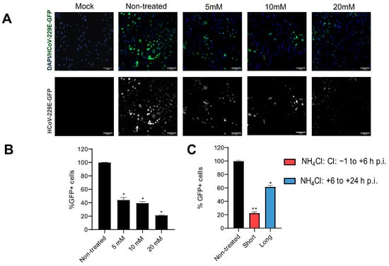 Inhibition of endosomal acidification prevents the entry of HCoV-229E in the Huh-7 cell line. Huh-7 cells were treated with NH4Cl at different concentrations for 1 h and during infection with HCoV-229E-GFP at an m.o.i. of 3. (A) Fluorescence microscopy images showing GFP-positive cells at 20 h p.i. and nuclei stained with DAPI for each condition. Scale bar = 100 µm. (B) The flow cytometry data report the mean percentage of GFP+ cells, normalized to the non-treated control. * p < 0.05 (n = 4). (C) Huh-7 cells were treated with 20 mM NH4Cl from 1 h before infection to 6 h p.i. (short times) or from 6 to 24 h p.i. (long times), with HCoV-229E-GFP at an m.o.i. of 3. The flow cytometry analysis reports the mean percentage of GFP+ cells at 24 h p.i., normalized to the non-treated control. * p < 0.05; ** p < 0.01 (n = 4).