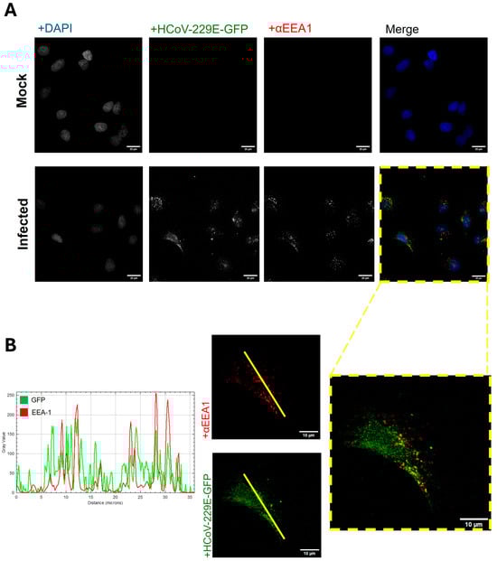 Quantitative confocal analysis of the colocalization of HCoV-229E and EEA-1 signal hot spots. (A) Cells were maintained with HCoV-229E for 15 min on ice and then incubated for 30 min at 33 °C. Then, they were fixed and labeled with the EEA-1 primary antibody and AlexaFluor-555-conjugated secondary antibody (red). The nuclei were stained with DAPI (blue). In the far-right panel, all three signal bandwidth images are combined, with colocalized red and green signals seen as yellow. Scale bar = 20 µm. (B) Two lineal sections were selected for each signal (yellow lines). The red EEA-1 and green viral GFP signal intensities in this line were plotted as a function of X–Y distance across the cell. Scale bar = 10 µm.