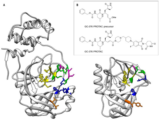 Comparison of the substrate-binding subsites (S1, S1′, S2, S4 and S5) of SARS-CoV-2 3CLPro (left) and of CVB3 3CPro (right) (A) and 2D structure of the GC-376 PROTAC and its precursor (B). In the two protein structures, the backbone and side chains of the residues of the subsites are color-coded (S1—yellow, S1′—orange, S2—blue, S4—green, S5—purple).