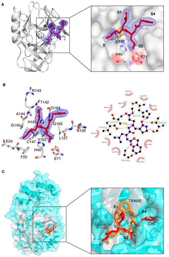 Concerning the presence of the protease ligand, we observed that the electron density is well defined for all atoms (Figure 2A). The ligand has been refined at full occupancy and the B-factor values of the atoms that are visible in the electron density are in line with those of the neighboring protein atoms. The most relevant feature is the binding mode of the ligand to the catalytic Cys147, which occurs via a covalent bond between C5 and the sulfur atom of Cys147. From a crystallographic point of view, this is supported by the fact that the bond length spontaneously refines to values around 1.8 Å, which is coherent with a C-S covalent bond. From a chemical point of view, it is known that the formation of a covalent (even reversible) bond between the unsaturated carbon and the sulfur atom is very likely [63,64]. Besides the covalent bond, other polar and non-polar interactions keep the protease ligand in place (Figure 2B). The protein atoms involved in direct hydrogen bond interactions with the ligand are, namely, the backbone oxygen of Thr142, one of the imidazole nitrogen atoms of His161, the backbone oxygen of Val162, the backbone nitrogen atom of Gly164 and the backbone nitrogen atom of Cys147. Several more residues are involved in hydrophobic interactions, and this is in agreement with the relatively non-polar nature of the ligand.
