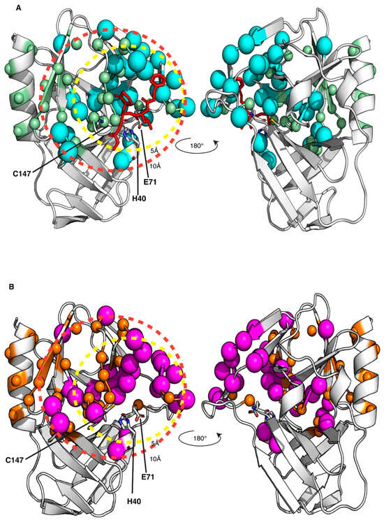 Mapping the interaction of the GC-376 PROTAC and its precursor with CVB3 3CPro onto the crystal structure of the protein bound to the GC-376 PROTAC precursor (PDB ID 8S6F). The backbone NHs showing chemical shifts changes larger than the threshold value, as observed in Figure S5A,B, are mapped as cyan and magenta spheres for the GC-376 PROTAC precursor (A) and GC-376 PROTAC (B) titrations, respectively. The backbone NHs, unassigned in the CVB3 3CPro and displaying increasing intensities along the stepwise additions of the GC-376 PROTAC precursor (light-green spheres) and of the GC-376 PROTAC (orange spheres) are also shown in panels (A) and (B) respectively. The dashed circles indicate spatial distances of 5 Å and 10 Å from the active site, demarcating regions surrounding the binding pocket. The catalytic triad is shown as sticks.