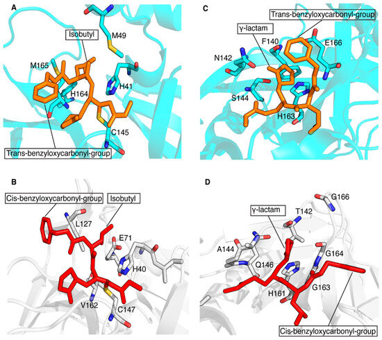 Structural comparison of the ligand–protein interactions in CVB3 3CPro (PDB ID 8S6F) and SARS-CoV-2 3CLPro (PDB ID 8OKB). The side chains of the residues surrounding the isobutyl group (A) and γ-lactam ring (C) of the GC-376 PROTAC precursor (in orange) are shown as sticks on the SARS-CoV-2 3CLPro structure. The trans-conformation of benzyloxycarbonyl group is indicated. The side chains of the residues surrounding the isobutyl group (B) and the γ-lactam ring (D) of the GC-376 PROTAC precursor (in red) are shown as sticks on the CVB3 3CPro structure. The cis-conformation of the benzyloxycarbonyl group is indicated. The key residues are shown as sticks.