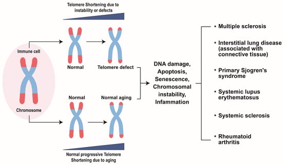 Schematic representation of the progression of autoimmune diseases due to telomere shortening. In normal individuals, cells undergoing continuous division develop shorter telomeres. A successive shortening of telomeres results in dysfunctional telomeres. This induces cell apoptosis, cell senescence, DNA damage, and chromosomal instability and may lead to inflammation and ultimately progress to the onset of autoimmune diseases. Meanwhile, genetic disorders or telomere defects may also lead to DNA damage and cellular dysfunctions, leading to the progression of autoimmune diseases.