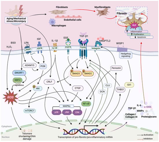 Fibrosis is one of the major pathomechanisms involved in HLF which is marked by the loss of elastic fibers and increase in collagen [8,10]. The ECM plays a key role in the repair of injuries in several kinds of tissues including muscles, and the correct remodeling of the ECM is essential for the healing process [46]. An excessive accumulation of ECM components leading to an aberrant wound-healing response defines fibrosis [47]. During fibrosis and scar formation, ECM synthesis is often mediated by myofibroblasts [48]. Fibrosis is often associated with inflammatory responses, where immune cells including neutrophils are recruited at the site of injury releasing chemoattractant cytokines causing further infiltration of other immune cells including monocytes and macrophages [49]. The activation of macrophages leads to increased TGF-β1 which activates resident fibroblasts in the injured tissue to induce their differentiation and the inhibition of apoptosis leading to excessive ECM deposition and fibrosis [50,51].