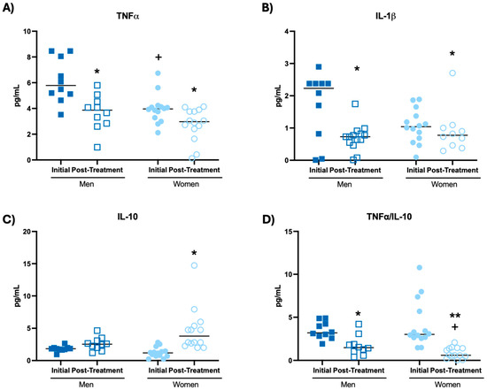 Cytokine concentrations (pg/mL) in plasma of participants before and after probiotic blend intakes. (A) TNF-α concentration. (B) IL-1β concentration. (C) IL-10 concentration. (D) TNF-α/IL-10 ratio. * p < 0.05, ** p < 0.01 compared to the initial condition. + p < 0.05 compared to men in the same condition.