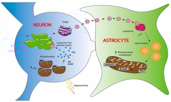 Without functional ApoE, the transfer of lipoprotein-like particles from astrocytes to neurons decreases, causing neutral lipid buildup in astrocytes, while stressed neurons struggle to transport excess toxic lipids to astrocytes during oxidative stress. In both scenarios, glial lipid droplets play a neuroprotective role; their failure to form can lead to increased neurodegeneration [,] (Figure 4B).