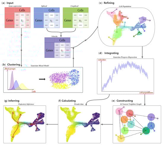 Overall workflow of the CPvGTI model: (a) The Input of CPvGTI, including a gene expression matrix, an unspliced mRNA count matrix, and a spliced mRNA count matrix; (b) Application of Gaussian Mixture Model clustering on gene expression matrix; (c) Refinement to segregate cells into Cell Population (CP), where RNA velocity is estimated first through the unspliced mRNA count matrix and spliced mRNA count matrix; (d) Gaussian Process Regression to integrate the gene expression and RNA velocity on CP level; (e) Construction of a K-Nearest Neighbor (KNN) graph with the directions provided by RNA velocity; (f) Calculation of pseudo-time for each cell. The darker the color, the earlier the inferred developmental time; (g) Trajectory inference, where the branches are marked with red arrows.