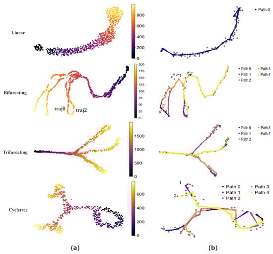The performance of CPvGTI on simulated datasets: (a) The ground truth of four datasets with different structures. The color is labeled as the real developmental time simulated by dyngen; (b) The trajectories generated by CPvGTI. The corresponding branches are labeled by the legend.