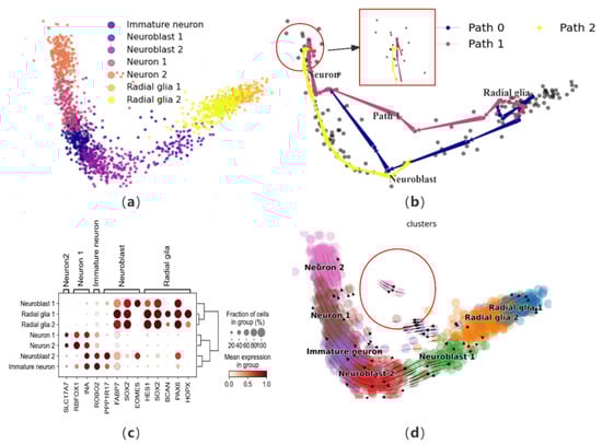 To further validate the effectiveness of CPvGTI, we perform trajectory reconstruction on a human forebrain glutamatergic neuron development dataset, comprising 1720 cells that outline the differentiation process of these neurons []. Initially, to gain an intuitive understanding of this neuronal differentiation process and terminal states, dimensionality reduction steps are conducted for visualization (Figure 4a). CPvGTI reconstructs the trajectory of glutamatergic neuron differentiation (Figure 4b), yielding a trajectory that adheres to an overarching linear structure. All paths align well with the progression of glutamatergic neuron differentiation, wherein radial glia cells transform into neuroblasts and subsequently mature into neurons.