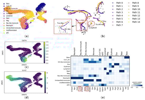 The performance of CPvGTI in mouse hematopoiesis dataset: (a) The ground truth of the mouse hematopoiesis dataset visualized through scatter plot. Different colors represent different cell types; (b) The fifteen trajectories generated by CPvGTI. Arrows are added to each lineage to indicate the direction of development. The figure marked by the large red box is a detailed representation of the figure indicated by the small red box. The red circle highlights the newly parts discovered through CPvGTI; (c) The matrixplot of the expression of marker genes; (d) The scatter plot of the marker gene Cd74. The lighter the color, the stronger the expression; (e) The scatter plot of the marker gene Lcn2. The lighter the color, the stronger the expression. The positions of the genes highlighted in red box can be visualized in (c,d).