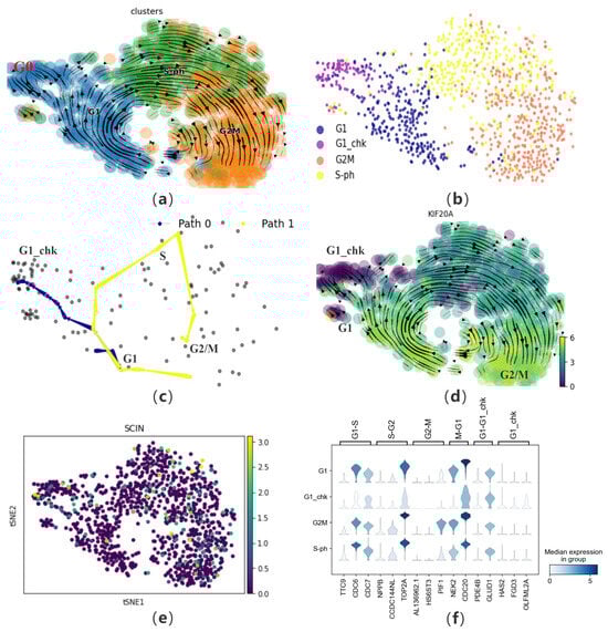 The performance of CPvGTI in human cell cycle dataset: (a) The velocity manifold graph of the dataset calculated by scVelo, where G0 and G1 is mixed; (b) The ground truth of the human cell cycle dataset visualized through scatter plot which is re-annotated. Different colors represent different cell types; (c) The two trajectories generated by CPvGTI. Arrows are added to each lineage to indicate the direction of development; (d) The velocity manifold graph of the cell cycle-dependent (CCD) protein KIF20A calculated by scVelo. The lighter the color, the stronger the expression; (e) The scatter plot of a protein unrelated to the cell cycle, SCIN. The lighter the color, the stronger the expression; (f) The stacked-violin plot of the expression on the marker genes.