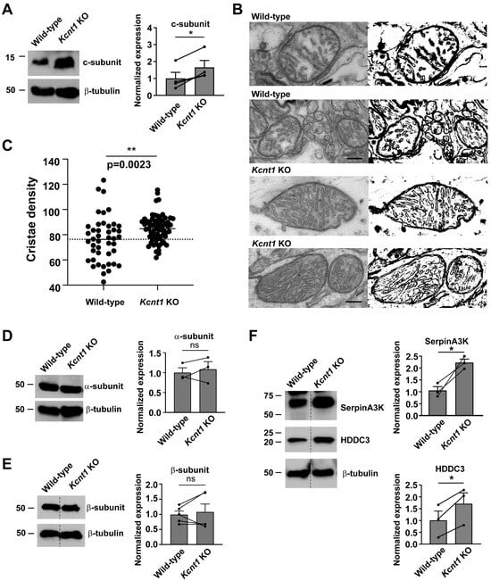 Changes in protein expression and mitochondrial structure in Kcnt1 KO cortical cortex. (A) Immunoblotting of c-subunit of ATP synthase in cortex. Right panel shows quantification (n = 4). (B) Transmission electron microscopy images of mitochondria in pyramidal neurons of wild-type and Kcnt1 KO cortex (left row). The images were converted to binary images (right row) for quantification with ImageJ. (C) Quantification of density of cristae from binary images (see Section 2). Dots represent crista density in individual mitochondria (unpaired t-test). (D–F) Immunoblots of the α-subunit (D) and β-subunit (E) of the mitochondrial ATP synthase, as well as of SerpinA3K and HDDC3 (F) in wild-type and Kcnt1 KO cortices. Quantification is shown in right panels right (n = 3–5, * p < 0.05, ** p < 0.01 paired t-test; ns, not significant). Original Western blot images are provided in the Supplementary Materials.