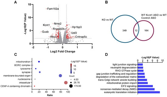 (A) Volcano plot of protein abundance change in WT mouse cortex with Kcnt1 ASO treatment compared to control ASO (p value < 0.01 and |log2 fold change| > 0.26). (B) Venn diagram of DEPs from WT mice with Kcnt1 ASO treatment and Kcnt1 KO mice. Functional (C) and pathway (D) analyses of DEPs found in WT mice treated with Kcnt1 ASO compared to control ASO.