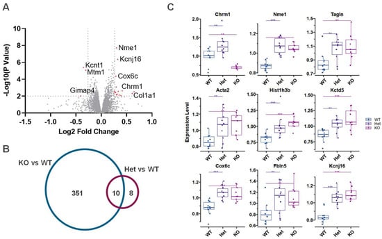 Using the criteria of a p value < 0.01 and a |log2 fold change| > 0.26, we found only 18 DEPs between the Kcnt1R455H/+ mice and wild-type mice (Figure 5A and Figure S4), suggesting that this Kcnt1 mutation produces relatively small changes to the brain proteomes of adult mice. Ten proteins were found to be differentially expressed in both Kcnt1 KO and Kcnt1R455H/+ animals, with the majority being upregulated in both the knockout and the Kcnt1R455H/+ mutant mice (Figure 5B). These included the K+ channel Kcnj16 (Kir5.1), the K+ channel tetramerization domain-containing 5 protein Kctd5, as well as the nucleoside diphosphate kinase-1 (Nme1) (Figure 5C). Levels of the Kcnt1 protein were found to be decreased in the Kcnt1R455H/+ animals, as were the levels of the dual-specificity phosphatase Mtm1. The changes in Nme1 and Mtm1 suggest that the mutant channels may produce changes in cellular metabolism. Proteins that have been found to interact with Kcnt1 directly [,,,], including Fmr1, Eif4e, Phactr1, and Cyfip1, showed no changes in expression in either the Kcnt1R455H/+ or KO mice (Figure S5). Most of the mitochondrial membrane proteins that were markedly altered in Kcnt1 KO mice did not show significant abundance changes in Kcnt1R455H/+ mice, except for Cox6c (FC = 1.22, p = 4.43 × 10−5), Atp5mf (FC = 1.14, p = 3. × 10−4), Atp5pb (FC = 1.15, p = 8.82 × 10−4), and Uqcrq (FC = 1.15, p = 8.48 × 10−5), which displayed the same direction of abundance change as in the Kcnt1 KO mice. Interestingly, only one protein, muscarinic acetylcholine receptor M1 (Chrm1), showed an opposite direction of change, being significantly increased in Kcnt1R455H/+ mice and downregulated with Kcnt1 KO. These data indicate that the changes produced by the gain-of-function mutation are not simply the inverse of the changes observed with the loss of function.