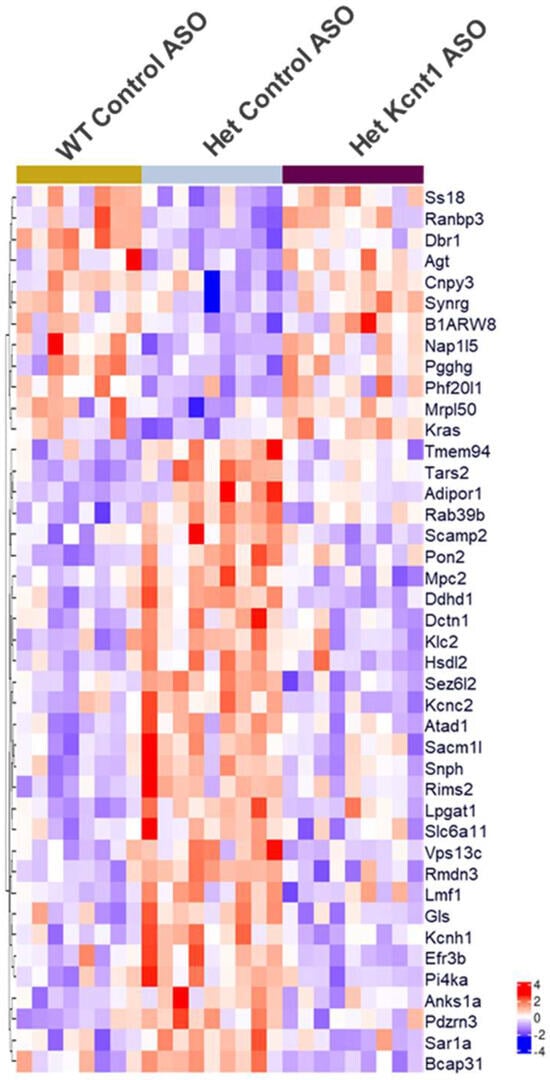 Because the changes in the abundance of biologically relevant proteins in response to either the Kcnt1R455H/+ mutation or to ASO treatment may be small, we further analyzed the effects of the Kcnt1 ASO using only the criterion of a p value < 0.01. This would be expected to capture a broader spectrum of the potential effects from both the Kcnt1 mutation and the Kcnt1 ASO treatment and identify additional potential targets for future research. With this criterion, 42 proteins were found to be dysregulated in the Kcnt1R455H/+ mice, and their expression levels restored to wild-type levels with Kcnt1 ASO treatment (Figure 7). Proteins related to synapses (Atad1, Pdzrn3, Sacm1l, Gls, Kcnc2, Kcnh1, Rims2, Slc6a11, Snph) and proteins with ion transmembrane transporter activity (Mpc2, Kcnc2, Kcnh1, Slc6a11) were found to be increased in the mutant mouse brain, but their expressions were restored with Kcnt1 ASO treatment. It was also found that the Kcnt1 ASO was able to attenuate the expression of several mitochondrial proteins including Atad1, Gls, Mpc2, Rmdn3, and Tars2, of which the mitochondrial membrane proteins Atad1, Mpc2, and Rmdn3 were significantly increased in the mutant mice.