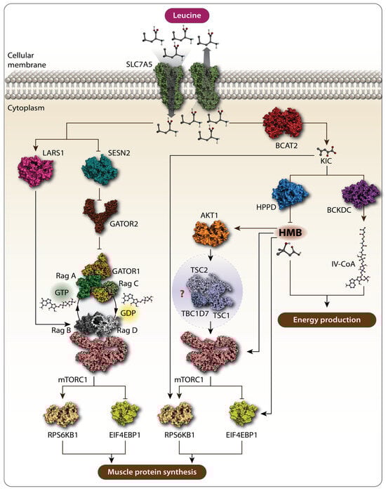 The muscle protein mass is maintained by a dynamic equilibrium between muscle protein synthesis (MPS) and muscle protein breakdown (MPB), determining the net protein balance []. Leu has been shown to play a particularly central role in MPS [], stimulating a robust MPS response in humans at a relatively low dose of about 3 g, even in the absence of other amino acids []. Unlike other essential amino acids, Leu is mainly metabolized within the skeletal muscle, where, with the help of the mitochondrial branched-chain amino transferase 2 (BCAT2), Leu is converted to its keto-acid, α-ketoisocaproate (KIC), which can be further metabolized either to isovaleryl-CoA by the branched-chain α-keto acid dehydrogenase complex (BCKDC) or to β-hydroxy-β-methylbutyrate (HMB) by KIC dioxygenase, ultimately serving as an energetic substrate for the citric acid cycle to produce energy (Figure 1) [,]. Both Leu itself and its metabolites, KIC and HMB, have been shown to increase MPS (Figure 1) [,,]. Due to Leu’s crucial role in regulating protein metabolism, it is used to combat protein loss in patients with various pathological conditions. This is supported by recent trials, which demonstrated that Leu supplementation improved sarcopenia in older adults [,,,]. The mechanism by which Leu and its metabolites enhance protein synthesis in muscle involves the activation of the mechanistic target of the rapamycin complex 1 (mTORC1) signaling pathway [,]. This pathway is a key regulator that integrates various cellular processes, including protein synthesis []. mTORC1 senses signals from both intra- and extracellular cues, including the availability of amino acids. As a result, nutrient sensing and responding to their availability are considered the primary functions of mTORC1. Specific transporters are involved in bringing amino acids into the cells. For Leu, the solute carrier family 7 member 5 (SLC7A5)/SLC3A2, a heterodimeric bidirectional transporter, is responsible for transporting extracellular leucine into the cells in exchange for intracellular L-glutamine []. Within the cell, the lysosome is considered a key site for amino acid sensing, where specific proteins, known as amino acid sensors, help mTORC1 detect amino acids. For Leu, the major detectors in the cytosol are leucine-tRNA ligase (LARS1) and sestrin 2 (SESN2) [,,,]. These sensors closely interact with Ras-related guanine triphosphatase (GTP)binding proteins (RagA, B, C, and D), a small GTPase family, as well as GTPase-activating proteins, such as the multiprotein complex GTPase-activating proteins toward Rags (GATOR), such as GATOR1 and GATOR2, in order to communicate information about amino acid availability to mTORC1 []. Upon Leu availability, LARS1 specifically interacts with the RagA–RagC or RagB–RagD heterodimers, promoting the proper nucleotide loading state, which is essential for mTORC1 activation. LARS1 functions as a GTPase-activating protein towards RagD–GTP, which further facilitates the activation of the mTORC1 pathway []. Additionally, Leu binds to SESN2, causing its dissociation from GATOR2, which removes the inhibitory effect of GATOR1 on mTORC1, ultimately activating the pathway (Figure 1) [,]. Once activated, mTORC1 phosphorylates p70 ribosomal protein S6 kinase 1 (RPS6KB1) and eukaryotic translation initiation factor 4E-binding protein 1 (4E-BP1). The phosphorylation of RPS6KB1 enhances its kinase activity, further promoting protein translation, while the phosphorylation of 4E-BP1 prevents its association with eukaryotic translation initiation factor 4E (eIF4E), allowing translation initiation to occur (Figure 1) []. Through these mechanisms, Leu increases MPS via the activation of the mTORC1 pathway. However, Leu metabolites appear to be sensed differently from the Leu-sensing pathway described above. For example, KIC has been shown to increase protein synthesis by promoting the phosphorylation of mTORC1 substrates, RPS6KB1 and 4E-BP1 [,], although the upstream mechanism by which mTORC1 senses KIC remains unclear. More research has been conducted on HMB, another Leu metabolite. Earlier studies demonstrated that HMB increased the phosphorylation of mTORC1 downstream targets, RPS6KB1 and 4E-BP1, thereby enhancing skeletal MPS [,]. An independent study explored how HMB activates nutrient sensing upstream of mTORC1, suggesting that the effects of HMB on MPS may be mediated by the phosphatidylinositol 3-kinase (PI3K)-RAC-α serine/threonine-protein kinase (AKT1)-mTORC1 signaling axis []. Although the PI3K-AKT1 signaling pathway primarily transmits signals from growth factors and cytokines to mTORC1, acting as a major upstream regulator of the mTORC1 pathway, this study indicates that HMB might also influence mTORC1 through this pathway (Figure 1) [,]. PI3K, when activated in response to growth factors and cytokines, phosphorylates and activates AKT1. Active AKT1 then phosphorylates and inactivates TSC2, a component of the tuberous sclerosis complex (TSC), which includes TSC1, TSC2, and TBC1 domain family member 7 (TBC1D7). The TSC is a negative regulator of mTORC1, so its inactivation leads to the activation of the mTORC1 pathway [,]. Girón et al. [] demonstrated that HMB phosphorylates AKT1, mTOR, and its downstream targets, RPS6KB1 and 4E-BP1, thereby increasing protein synthesis. However, this study did not investigate whether AKT1 activates mTORC1 through the TSC, making it difficult to conclude whether HMB exerts its effects via the PI3K-AKT1-mTORC1 signaling axis. A more recent study provided evidence that HMB stimulates protein synthesis in skeletal muscle by inducing the autophosphorylation of mTOR, leading to the activation of the mTORC1 pathway without involving the SESN2-GATOR2 or Rag GTPase family proteins [] (Figure 1). These findings suggest that Leu metabolites, such as KIC and HMB, may be sensed independently of the traditional Leu-sensing pathway. However, further research is needed to reach a consensus 