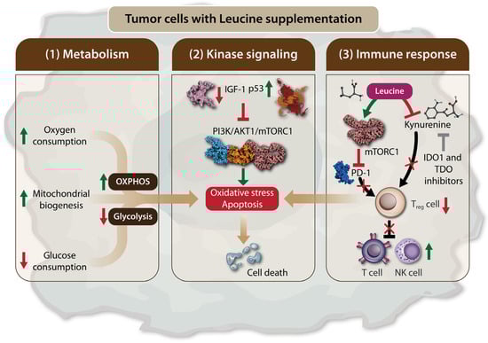 Leu supplementation leads to tumor cell death by inducing apoptosis and oxidative stress. Leu supplementation can lead to tumor cells death via the following three mechanisms: (1) The modulation of tumor cell metabolism. Leu supplementation favors oxidative phosphorylation (OXPHOS) over glycolysis by increasing oxygen consumption and mitochondrial biogenesis, while reducing glucose consumption. This metabolic shift promotes apoptosis and oxidative stress in tumor cells; (2) The regulation of the mTORC1 signaling through kinase pathway. Leu supplementation inhibits the expression of insulin-like growth factor 1 (IGF-1) and increases p53 levels. This results in the inhibition of the PI3K/AKT1/mTORC1 signaling axis in tumor cells, leading to apoptosis and tumor cell death; (3) The modulation of the immune response. Leu supplementation enhances anti-tumor immunity by inhibiting immunosuppressive regulatory T cells. This effect is mediated by mTORC1 activation, which leads to the inhibition of programmed cell death protein 1 (PD-1). Additionally, Leu competes with kynurenine in the kynurenine pathway (KP), thereby restoring the antitumor effects of T cells and natural killer (NK) cells. Therefore, the inhibitory effect of Leu, in combination with indoleamine 2,3-dioxygenase 1 (IDO1) and tryptophan 2,3-dioxygenase (TDO) inhibitors on kynurenine. Arrows in green stand for “activation”, “stimulation”, “increase in level”. Arrows in red stand for “decease in level”. Red bars and crosses stand for “inhibition”.