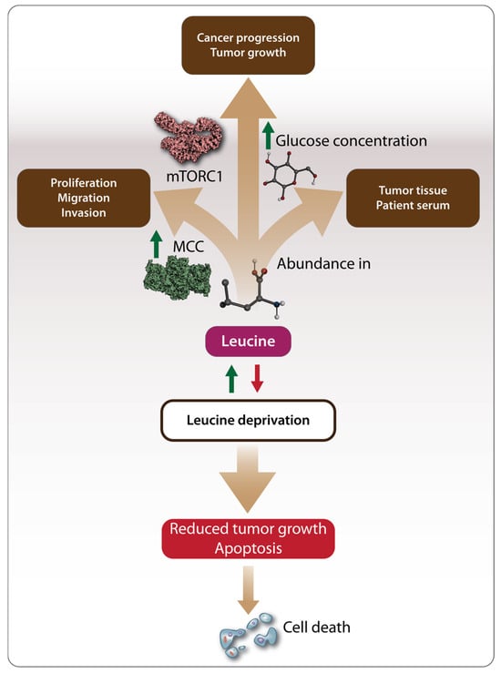 Although the studies mentioned above in Section 3.1 highlighted the anticancer effects of Leu, an increasing body of research suggests that Leu may also have pro-oncogenic effects. Like other amino acids, Leu can serve as an energy source, potentially fueling cancer development []. The pro-oncogenic effects of Leu have been studied in various cancers, including hepatocellular carcinoma (HCC), breast cancer, and pancreatic cancer (Table 1). In contrast to the findings of Hassan et al. [], Chen et al. [] demonstrated that the growth of HCC cell lines depends on the presence of Leu, with deprivation significantly reducing the proliferation, migration, and invasion of cancer cells. This pro-oncogenic effect was linked to the regulation of Leu metabolism by enzymes such as the mitochondrial methylcrotonoyl-CoA carboxylase (MCC) enzyme, which is highly expressed and associated with poor prognosis in HCC patients [] (Figure 3). The pro-oncogenic role of Leu in HCC has also been supported by recent metabolomics studies, which identified Leu as one of the amino acids significantly upregulated in both HCC tumor tissues and the serum of HCC patients []. Another recent study using mendelian randomization (MR) methods explored the possible causal relationship between genetically predicted circulating BCAA concentrations and various cancers by leveraging the large datasets for BCAAs provided by genome-wide association studies (GWAS). The results showed elevated circulating total BCAA levels and leucine levels, indicating a positive association between leucine and squamous cell lung cancer [].