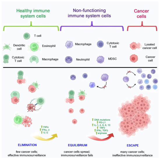 Moreover, the recruitment of immune system cells into the TME lays the conditions for the final stage, when cancer cells can largely escape immunosurveillance, and grow and spread without control. Since in both elimination and equilibrium, tumor cells tend to be completely obliterated, early diagnosis can only be performed during the escape phase.