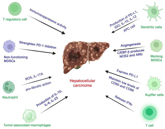 As outlined above, MDSCs play a number of roles in the development of many cancers, including the enhancement of angiogenesis and promotion of pre-metastatic niches [196]. Moreover, they steer the activation of specific pathways, including autophagy, CREB signaling, cell cycle, CSF1, G-protein, GnRH, IFN-γ, IL-3 activation, MAPK, and mTOR [197]. However, how these cells act within the specific case of HCC’s tumor microenvironment has not yet been well established. Studies on MDSCs in patients with liver resection for HBV-related HCC found that tumor resection was followed by a decrease in the number of MDSCs and CD8+ T cells but had no effects on CD4+ T cells [198]. Conversely, high levels of MDSCs after resection correlated with early cancer recurrence. Recent studies have investigated the use of specific molecules like RORC1, PIR-B, ILTs, and C/EBP to modulate MDSCs. In HCC, MDSCs’ immunosuppressive activity was enhanced by the ability of C/EBP-β to regulate the expression of immunosuppressive genes like NOS2 and ARG [199]. Considering the many ways in which MDSCs are involved in cancer development and progression, they make a promising target for immunotherapy. However, the molecular mechanisms underlying MDSCs’ inhibiting action in HCC remain not fully understood. Moreover, considering the heterogeneity that characterizes MDSCs, further research should aim to investigate the outcomes of using different MDSC subpopulations as targets (Figure 4).