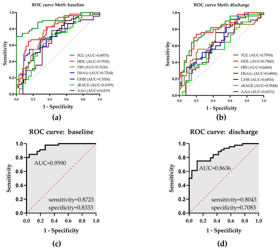 Univariate and multivariate logistic regressions for the appearance of MetS. (a) ROC for chosen parameters with subgroup differences at admission to rehabilitation and (b) at discharge. Multivariate logistic regression with TGL, HDL, FBS, HbA1c, UHR, sRAGE, and AAct (c) at admission and (d) discharge. AUC, sensitivity, and specificity are shown within the graphs. The red dashed line represents the chance discrimination level.