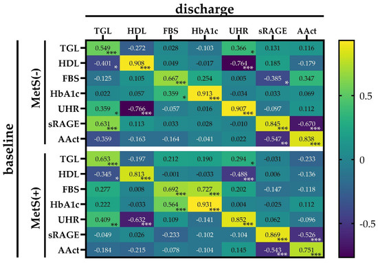 Heatmap reporting Spearman correlation coefficient (r) and significances referred to correlations between baseline and discharge values of the predictive parameters in the MetS(−) and MetS(+) subgroups. The bar on the right side of the map indicates the color legend of the Spearman correlation coefficients, and the asterisk within the squares indicates the significances for each pair of parameters in the matrix. *: p < 0.05; **: p < 0.01; ***: p < 0.001.