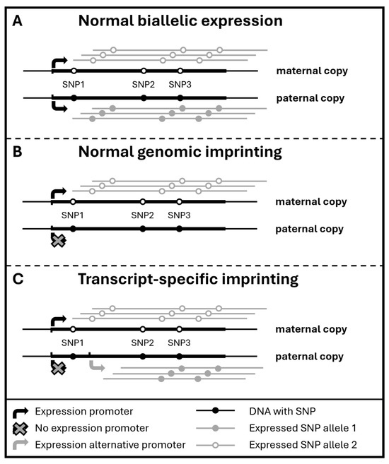 Genomic and transcript-specific imprinting. This figure illustrates three scenarios of gene expression, for an individual heterozygous for three SNPs. (A) Normal biallelic expression, where both copies of a gene are expressed, so that for all SNPs, both allelic variants are present in the transcripts. (B) Genomic imprinting, where only one parental copy (e.g., maternal) is expressed, leading to the expression of only the allelic variants inherited from that parent for all SNPs. (C) Transcript-specific imprinting, which occurs when some transcripts are exclusively paternally expressed and others exclusively maternally expressed, caused here by alternative promoter usage. This results in a mixed situation, with monoallelic expression for SNP1 but the biallelic expression of SNPs located in exons shared between maternal- and paternal-specific transcripts (SNP2 and SNP3). For simplicity, this depiction excludes splicing, though alternative splicing may also contribute to transcript-specific imprinting.