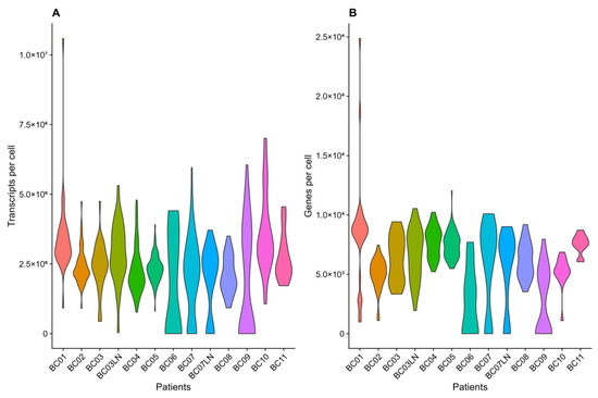 Comparative analysis of gene expression metrics in patient scRNA sequencing data. The left plot (A) displays the total transcript count per cell, while the right plot (B) visualizes the number of genes detected per cell. The width of each violin corresponds to the frequency of cells at a particular expression metric level, providing an intuitive understanding of the data’s underlying structure. Patient sample ID labels marked with an additional LN refer to metastatic samples obtained from the same patients.