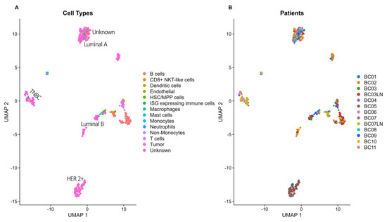 Comparative analysis of cell type distribution in tumor specimens from 11 patients. The left plot (A) visualizes the various cell types detected within the tumor specimens, with cells colored according to their inferred cell type. Unknown and tumor cell clusters are labeled as “unknown” or as the corresponding tumor subtype (luminal A, luminal B, HER2+ and TNBC). The right plot (B) displays the distribution of individual cells across the patients, highlighting cellular heterogeneity within the tumor samples. Yet when considering both panels simultaneously, patient cancer cells cluster per cancer subtype. Patient sample ID labels marked with an additional LN refer to metastatic samples obtained from the same patients.