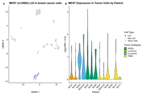 MEST expression across cells and patients. (A) Biallelic expression of rs10863 (MEST gene) in HER2+ tumor cells. Cells with clear LOI are indicated in red within the HER2+ tumor cluster for patient BC05, while non-LOI cells for that patient are shown in sky blue. Other cells are displayed in grey. Cells in the HER2+ tumor (BC05) cluster that are not labeled as LOI or non-LOI were either not identified as tumor cells or lacked sufficient SNP coverage. (B) MEST gene expression (log counts per million +0.5) across all patients, categorizing cells across different tumor subtypes indicating that LOI is not associated with MEST downregulation.