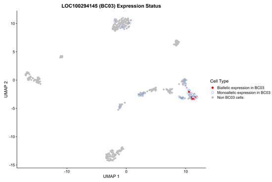 However, it is clear that integrating single-cell data also provides major benefits, for example, by demonstrating that biallelic expression/LOI is clearly present in tumor cells (as observed for MEST) rather than in the normal cells infiltrating/present in the tumor mass. This is particularly relevant for genes featuring random monoallelic expression (RME): such genes often show a major bias towards a single random (rather than parent-of-origin specific) allele, which leads to an allele-specific expression profile very similar to an imprinted gene with some minor LOI. For example, several SNPs (rs241402 and rs6912492) at LOC100294145 (candidate imprinted gene according to [4]) exhibited biallelic expression in multiple single cells of a luminal B metastatic tumor sample (BC03 LN), and biallelic expression was also detected in the bulk RNA sample for the same patient (Table 2, Supplementary Table S7). However, at the single-cell level, biallelic expression was only observed in immune B-cells (Figure 6). As this gene is located in the human leukocyte antigen (HLA) cluster with multiple RME genes, the results presented here clearly demonstrate that RME is a far more likely explanation for LOC100294145 than (loss-of) imprinting. Similarly, SNP rs241408 of the same gene (LOC100294145) exhibited biallelic expression in a TNBC bulk RNA patient (BC09) (Supplementary Table S7), even though it was not visible in single cells. This emphasizes the importance of integrating bulk RNA with single-cell RNA data to better distinguish cancer-specific LOI from RME.
