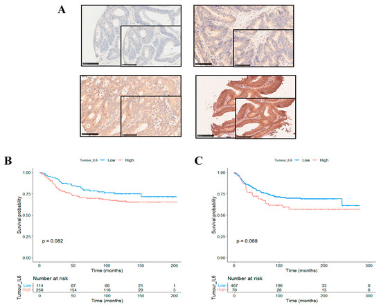 This study aimed to investigate the expression of IL6R within a large cohort of retrospectively collected CRC patient biospecimens via immunohistochemistry and IL6 via RNA sequencing and RNAScope® to determine association with patient prognosis and clinicopathological characteristics.