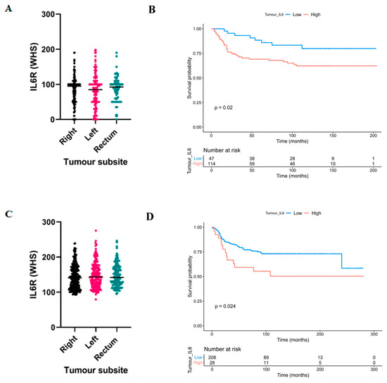 Given the evidence in the literature for differences in the underlying biology of tumours arising in different subsites of the bowel, we investigated if expression of IL6R was different between right-sided or left-sided colon and rectal cases. Despite no difference in expression intensity between subsites (Figure 2A), the association between high IL6R and reduced CSS was potentiated in right-sided colon cases in cohort 1 (HR = 2.402, 95% CI; 1.117–5.164, p = 0.020) (Figure 2B). There was no association between IL6R expression and outcome in left-sided colon or rectal cancers (Supplementary Figure S1A,B). In concordance with cohort 1, no difference in IL6R expression intensity was observed between subsites in cohort 2 (Figure 2C), and the association between high IL6R expression and poorer outcome was potentiated in right-sided colon cases (HR = 1.995, 95%CI; 1.083–3.675, p = 0.024) (Figure 2D). Similarly, there was no association in left-sided colon or rectal cancers (Supplementary Figure S1C,D).