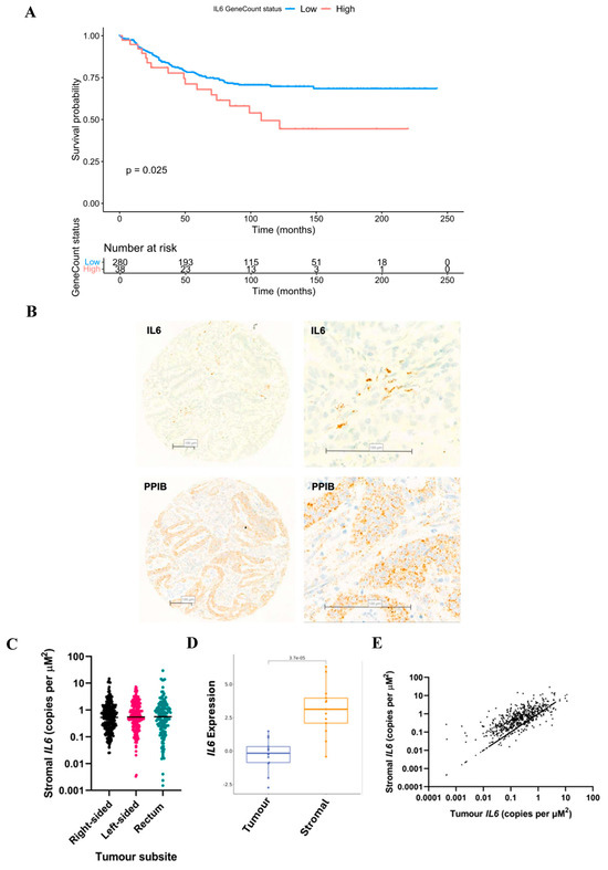 IL6 is the cognate binding partner for IL6R; therefore, we investigated its expression within bulk transcriptomics data available from a subset of patient cohort 2 (n = 319). High expression of IL6 was associated with reduced cancer-specific survival (p = 0.025) (Figure 3A). Although this result was interesting, bulk RNA sequencing did not permit analysis of IL6 with respect to different tumour compartments. Therefore, we next sought to explore expression of IL6 within the tumour epithelium and stromal areas of TMAs from patient cohort 1. Due to the secretory nature of IL6, IHC was not an appropriate technique. During optimisation, IHC staining for IL6 yielded a brown blush staining pattern observed across the whole tissue with no specificity to cell type or location, and therefore RNAScope® was utilised.