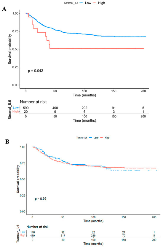 Kaplan Meier survival analysis indicated that high expression of IL6 within the tumour-associated stroma was predictive of reduced CSS in the full cohort (HR = 1.974, 95%CI; 1.009–3.860, p = 0.042) (Figure 4A). Conversely, there was no association between CSS and IL6 quantified within the tumour epithelium (HR = 0.997, 95%CI; 0.701–1.418, p = 0.987) (Figure 4B). There was no difference between tumoural or stromal IL6 expression relative to tumour sidedness (Supplementary Figure S4A,B), and contrary to IL6R, there was no association between IL6 in either compartment with CSS when patients were further stratified into right-sided colon cases (Supplementary Figure S4C,D).