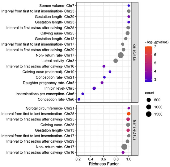 Over-represented reproduction-related traits (QTLs) from cattle QTLdb overlapping cis and trans eQTLs identified from bovine uterine luminal epithelial cells. The x-axis represents the ratio between the number of observed QTLs and the expected number of that QTL, while the y-axis represents the over-represented traits. The color scale indicates the -log10 (p-value) and the dot size indicates the number of observed QTLs for that trait. Only significant traits are shown (FDR ≤ 0.05).