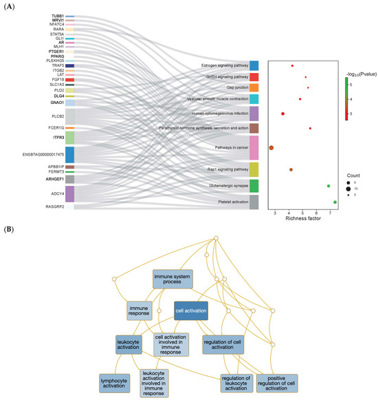 Over-represented functional categories for differentially expressed genes (DEGs) from bovine uterine luminal epithelial cells. DEGs were retrieved from Martins et al. [14]. Functional analysis results were based on WebGestalt. (A) Sankey and dot plots showing the pathways connected to the DEGs. Genes affected by eQTLs are highlighted in bold. The color scale indicates the −log10 (p-value), and the size of the dot indicates the number of observed genes for that pathway. (B) Directed acyclic graph of the significant biological processes. The darker the blue background color in the squares, the more significant is the term (p-value ≤ 0.01).