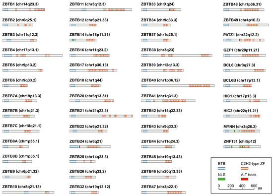 Schematic representation of ZBTB family members and their encoded domains. The sequences of ZBTB proteins and their functional information are obtained from the UniProk Knowledgebase (UniProtKB) [10] and National Center for Biotechnology Information (NCBI). aa, amino acids; BCL6, BCL6 transcription repressor (also known as ZBTB27); BCL6B, also known as ZBTB28; BTB, bric-a-brac/tramtrack/broad complex; C2H2-type ZF, C-terminal Cys2His2/Krüppel-type zinc finger; chr, chromosome; GZF1, GDNF-inducible zinc finger protein 1 (also known as ZBTB23); HIC1, HIC ZBTB transcriptional repressor 1 (also known as ZBTB29); HIC2, also known as ZBTB30; MYNN, myoneurin (also known as ZBTB31); NLS, nuclear localization signal; PATZ1, POZ/BTB and AT hook-containing zinc finger 1 (also known as ZBTB19); ZNF131, zinc finger protein 131 (also known as ZBTB35).