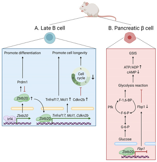The physiological roles of Zbtb20 in mice. (A) Zbtb20 facilitates plasma cell differentiation via an Irf4/Zbtb20/Prdm1 axis, in which Zbtb20 induction does not require Prdm1 but depends on Irf4 by directly binding to the Zbtb20 promoter. Zbtb20 also induces cell survival and blocks cell cycle progression by regulating the Tnfrsf17, Mcl1, and Cdkn2b genes, thus promoting plasma cell longevity. (B) In murine pancreatic β cells, Zbtb20 regulates glucose sensing and insulin secretion by repressing Fbp1, which encodes a gluconeogenic enzyme that regulates glucose metabolism and insulin secretion in β cells. ADP, adenosine diphosphate; ATP, adenosine triphosphate; cAMP, cyclic adenosine monophosphate; Cdkn2b, cyclin-dependent kinase inhibitor 2B; F-1,6-BP, fructose-1,6-bisphosphate; F-6-P, fructose-6-phosphate; Fbp1, fructose-1,6-bisphosphatase 1; G-6-P, glucose-6-phosphate; GSIS, glucose-stimulated insulin secretion; Irf4, interferon regulatory factor 4; Mcl1, myeloid cell leukemia sequence 1; Pfk, phosphofructokinase. Prdm1, PR domain-containing 1, with ZNF domain; Tnfrsf17, tumor necrosis factor receptor superfamily, member 17.