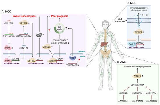In contrast to mice, ZBTB20 has also been implicated in the reactivation of AFP in human HCC cells via a microRNA (miR)-122-mediated regulatory axis, in which ZBTB20 acts as a negative regulator of invasive phenotypes [83] (Figure 3A). Conversely, other studies revealed the increased ZBTB20 expression as an independent marker for poor prognosis in patients with HCC [84,85]; however, it remains unclear how increased ZBTB20 expression affects prognosis. One mechanism is that ZBTB20 promotes cell cycle progression via suppressing forkhead box O1 (FOXO1), which in turn leads to the upregulation of cyclin D1 and cyclin E1 as well as the downregulation of cyclin-dependent kinase inhibitor 1A (CDKN1A) and CDKN1B [85]. ZBTB20 also participates in human HCC development and progression via correlation with SET domain-containing 7 (SETD7), a histone lysine methyltransferase involved in inflammation, metabolism, and oncogenesis [86]. On the other hand, ZBTB20-mediated regulation represents an important mechanism responsible for infection-associated HCC. For example, depletion of ZBTB20 in Huh7 human hepatocytes increases the percentage of hepatitis C virus (HCV)-infected cells and HCV production, indicating that ZBTB20 suppresses HCV infection [75], whereas in HCC patients with chronic infection of hepatitis B virus (HBV), HBV DNA integrates into ZBTB20, which is upregulated in tumor tissues and associated with HBV integration frequency [87]. These findings imply distinct ZBTB20-mediated regulation in human HCC caused by different hepatitis viruses, a topic that requires further exploration.