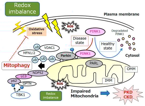 An illustrative representation and overview of PINK1, Parkin, and related molecules in the regulatory pathway for mitophagy. Under the healthy and steady state of cells, PINK1 is despoiled within the surface of mitochondria, which may be reduced by mitochondrial damage due to oxidative stress and/or redox imbalance, resulting in PINK1 and Parkin increases in the outer membrane of mitochondria. Mainly, the PINK1 could phosphorylate ubiquitin to activate the ubiquitin ligase activity for Parkin, where the Parkin is expected to be phosphorylated and ubiquitinated, resulting in the induction of mitophagy. OMM, outer mitochondrial membrane; IMM, inner mitochondrial membrane; MARK2, microtubule affinity regulating kinase 2; MFN1, mitofusin 1; MFN2, mitofusin 2; NDP52, nuclear dot protein 52; PARL, presenilin-associated rhomboid-like; OPTN, optineurin; PINK1, PTEN-induced kinase 1; ROS, reactive oxygen species; VDAC1, voltage-dependent anion channel 1; Ub, ubiquitin.